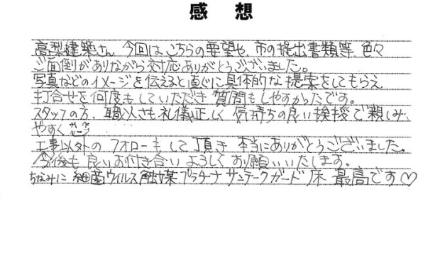あの台風から1年が経ちましたね。高梨建築様に感謝いっぱいで、私からもちゃんと御礼をしたい気持ちがあるのですがコロナ禍で今までのように行動できない面に悩んだり立ち止まっているうちにすっかり時が経ってしまいすみません。未だに修復した後の新しい実家にも行けていなくて...父から送られてくる実家の写真に、これがあの実家!?と見違えるようにきれいで驚きます。そのたび、感謝の気持ちでいっぱいになり、台風でたくさんの思い出を失った悲しみから新しい気持ちで、新しい思い出を刻んでいける楽しみがあります。末の妹が、きっと一番喜んでいて、無事初めてのお産が済み綺麗な実家で安心してママ生活をスタートさせることができました!